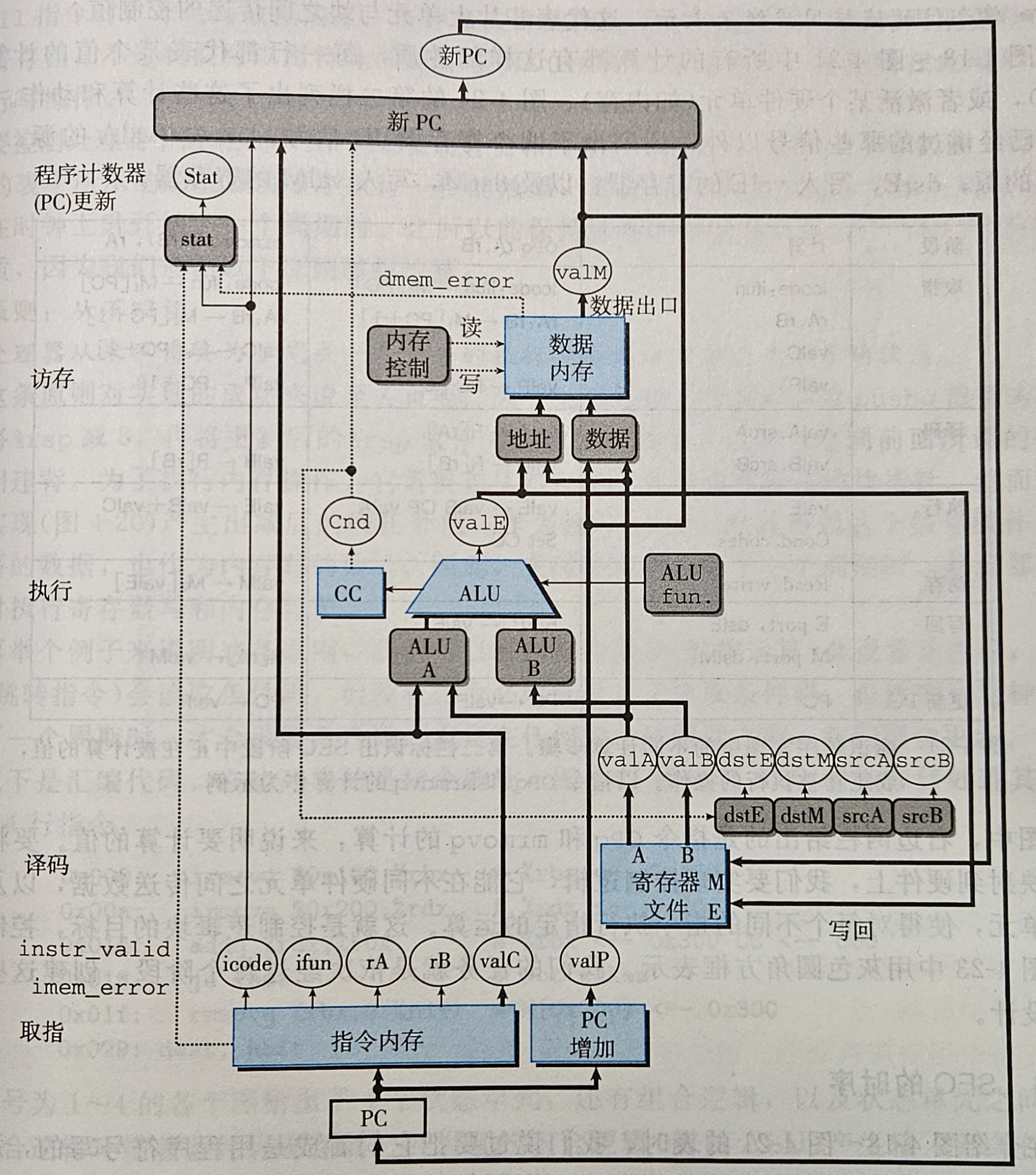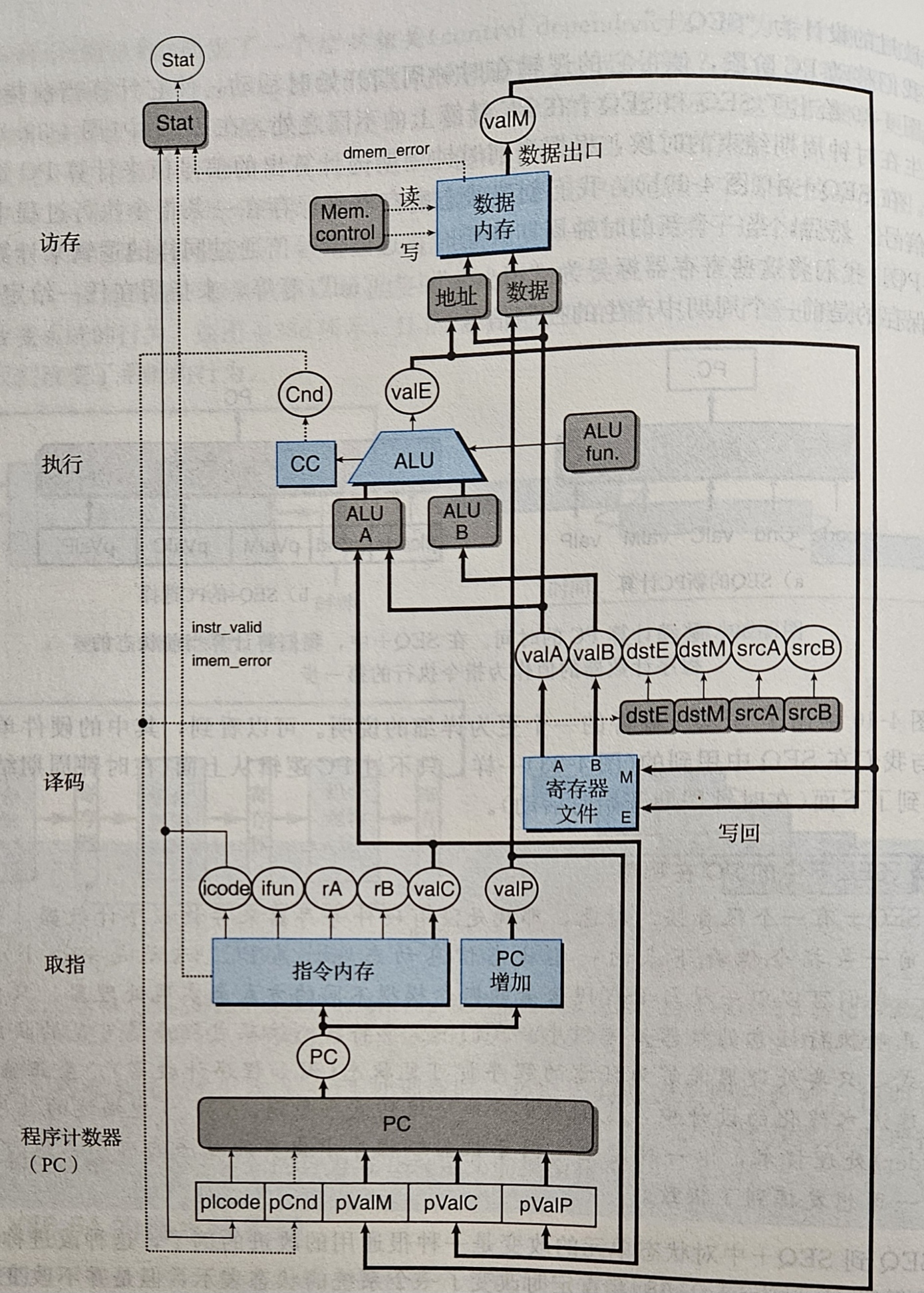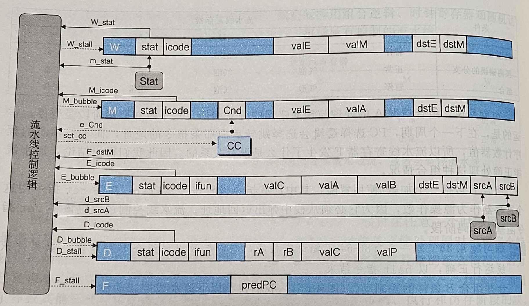 - 当一条指令导致了一个异常,而后面的指令已经更新了处理器的状态,比如 pushq %rax,此时的 %rsp 为 0x0000000000000000,那么 pushq 指令就会向 0xfffffffffffffff8 中插入数据,但是这会在访存阶段导致一个异常,如果后面紧跟着一条 addq 指令,那么指令就会在执行阶段更新 CC,但实际上并不应该对 CC 进行更改。所以我们应该要能够发现出现了这个异常然后停止执行。
