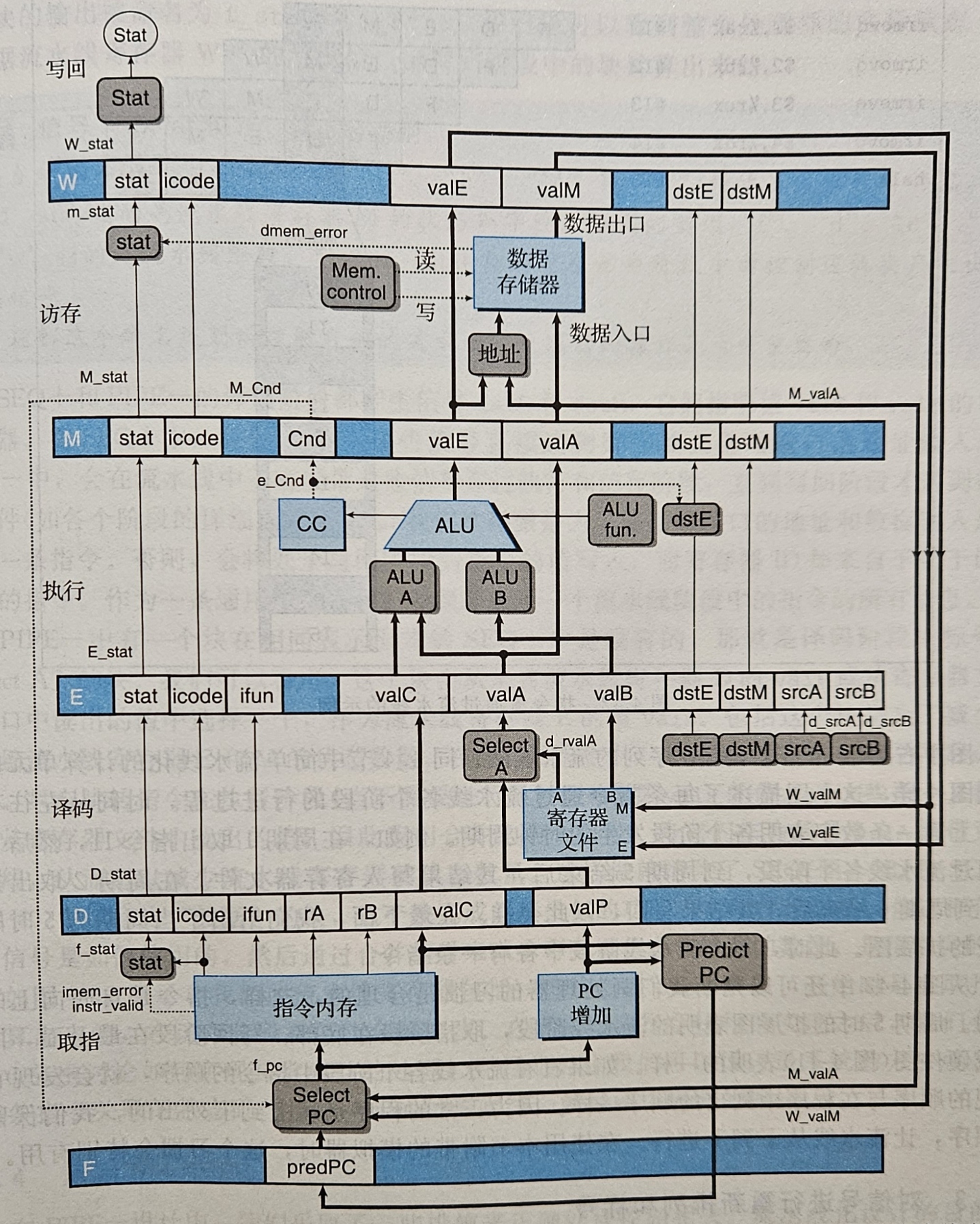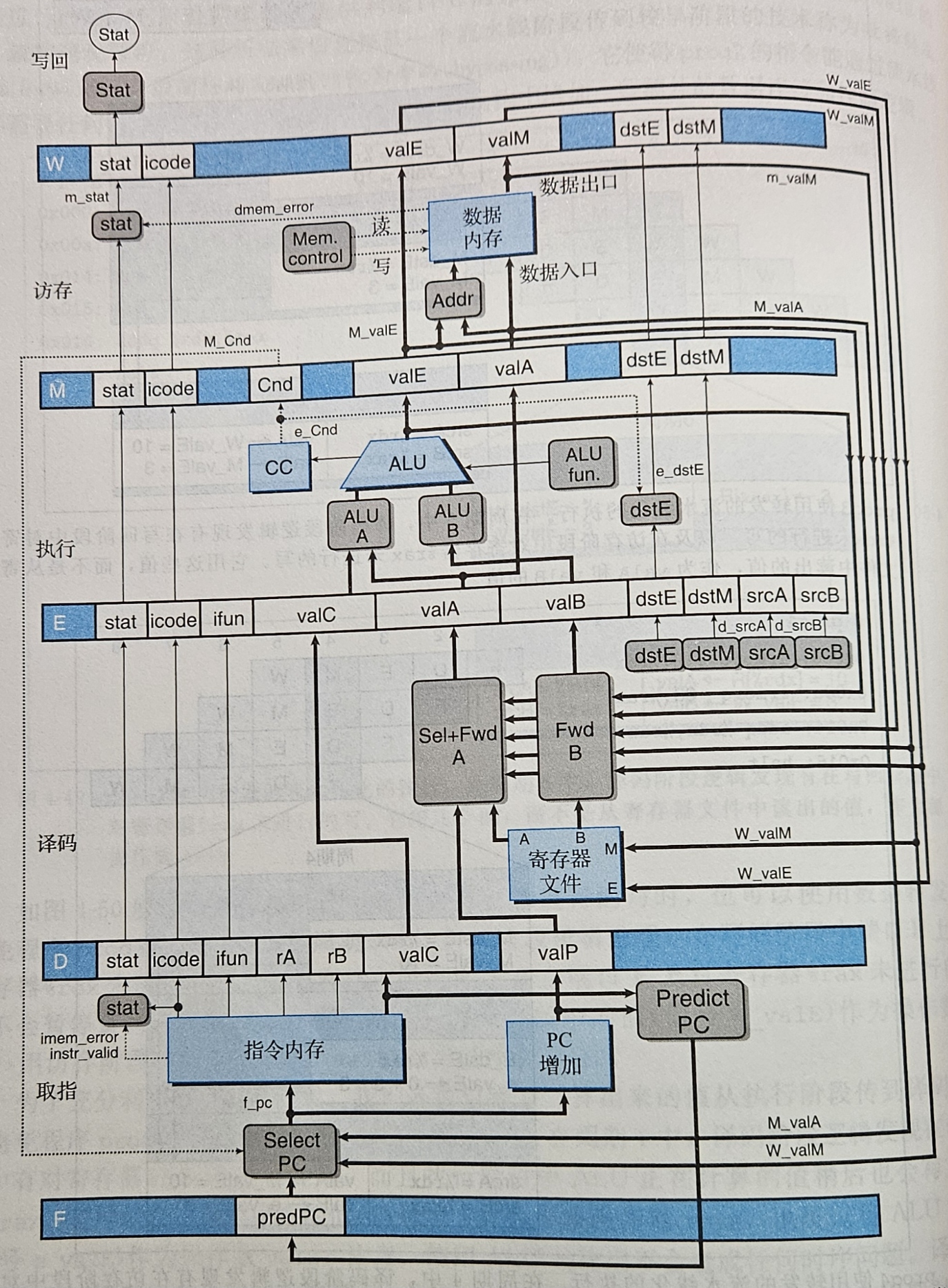 - W 保存访存阶段后的指令的信息以及从内存中读取的值,用于写回阶段和更新 PC