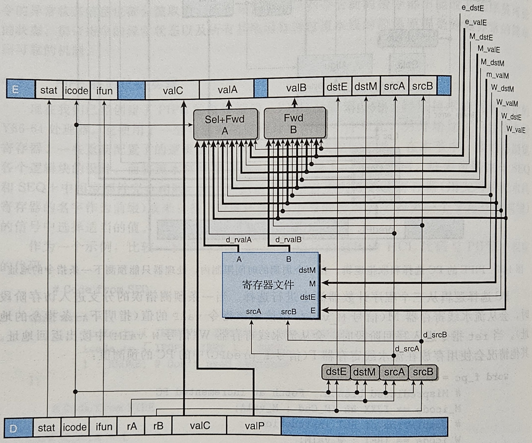 当流水线进行到第 4 个周期的时候,addlq 正处在 D 阶段中,此时第一条 irmovq 指令正在 M 阶段,它的 M_valE 的值是 10,第二条 irmovq 指令正在 E 阶段,它的 e_valE 的值是 3,所以我们可以在这两个信号处搭建旁路将信号转发到 D 阶段中,这样 D 阶段就能将正确的值写入流水线寄存器中,所以我们需要一个控制器来发现数据冒险然后选择使用转发过来的信号,解决数据冒险,同时为了保证泛用性,我们会将更多的信号进行转发,最后我们会将 e_valE、m_valM、M_valE、W_valM、W_valE 这五个信号进行转发,所以最后的设计如下: