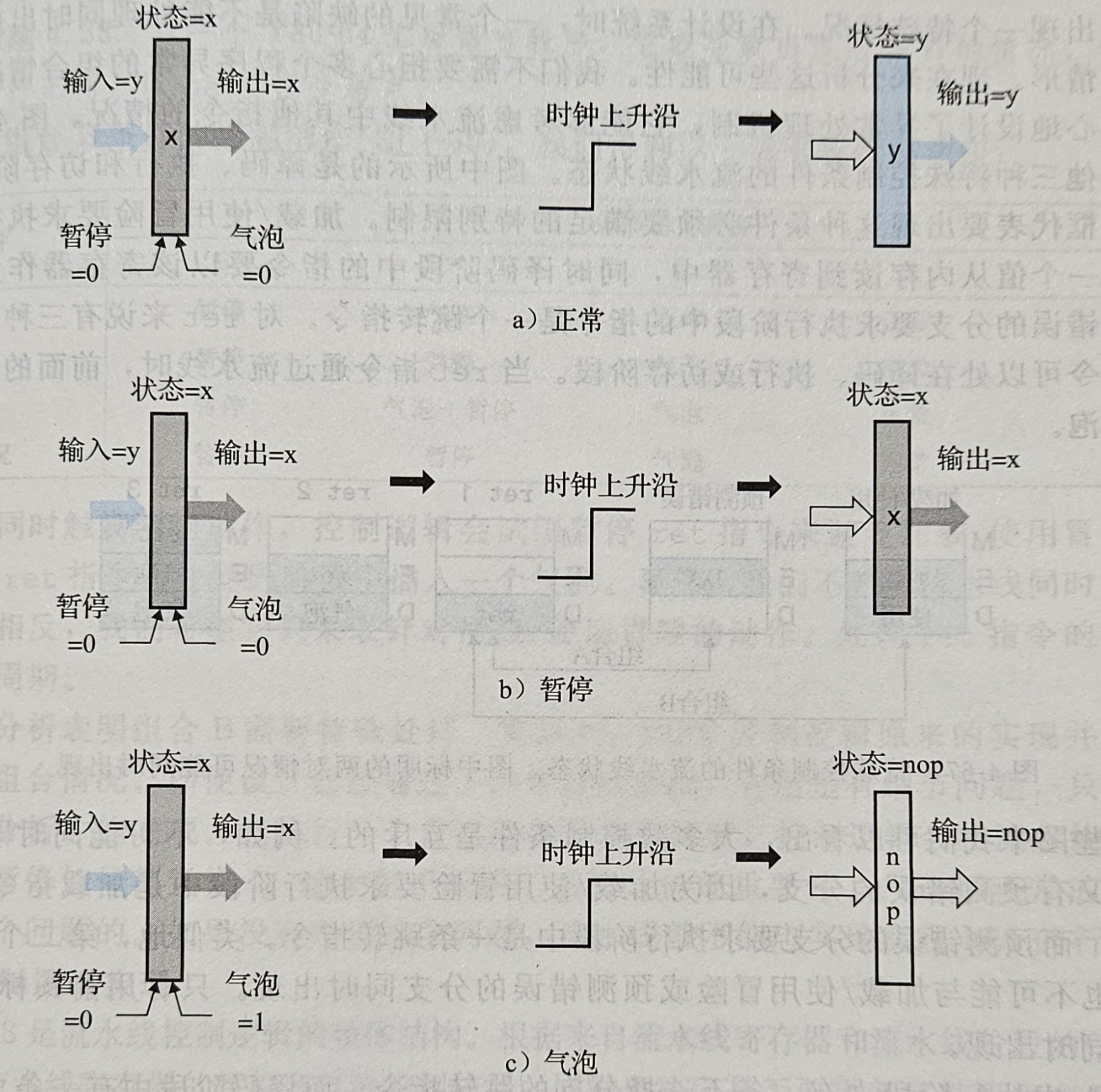 为了能够控制流水线,我们会为流水线引入几个机制,分别是正常,暂停和气泡,这三种模式分别会对流水线寄存器产生以下影响: