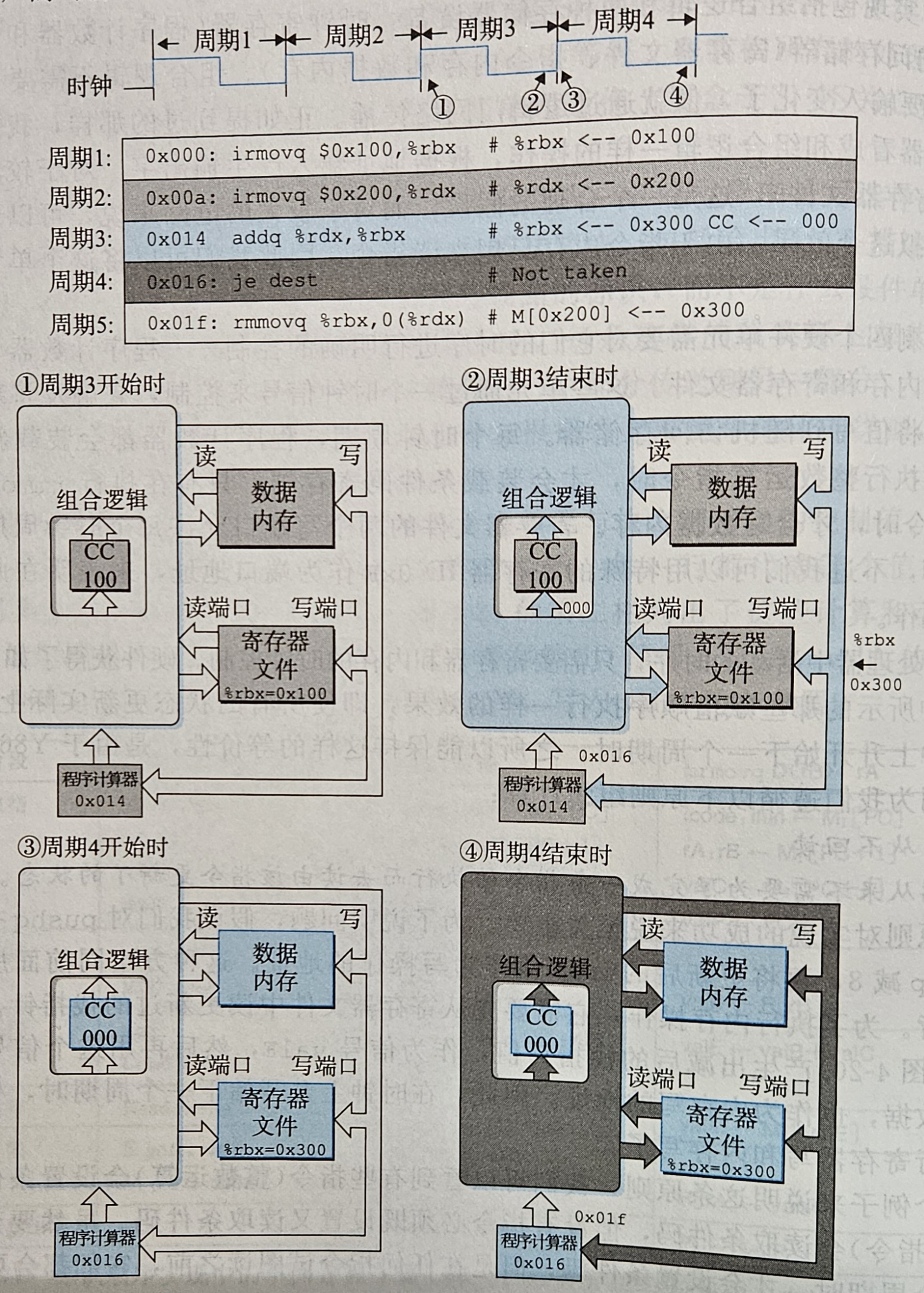 在第 4 周期时,addlq 进行译码时读取到的%rdx 和%rax 的值仍然是 0,因为前两条 irmovq 指令还没有完成 W 阶段,寄存器中的值还没有更新